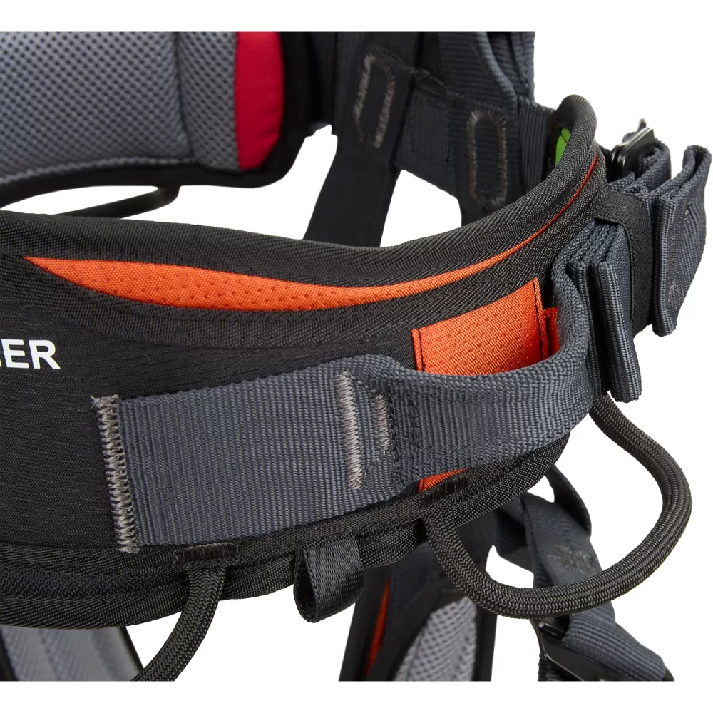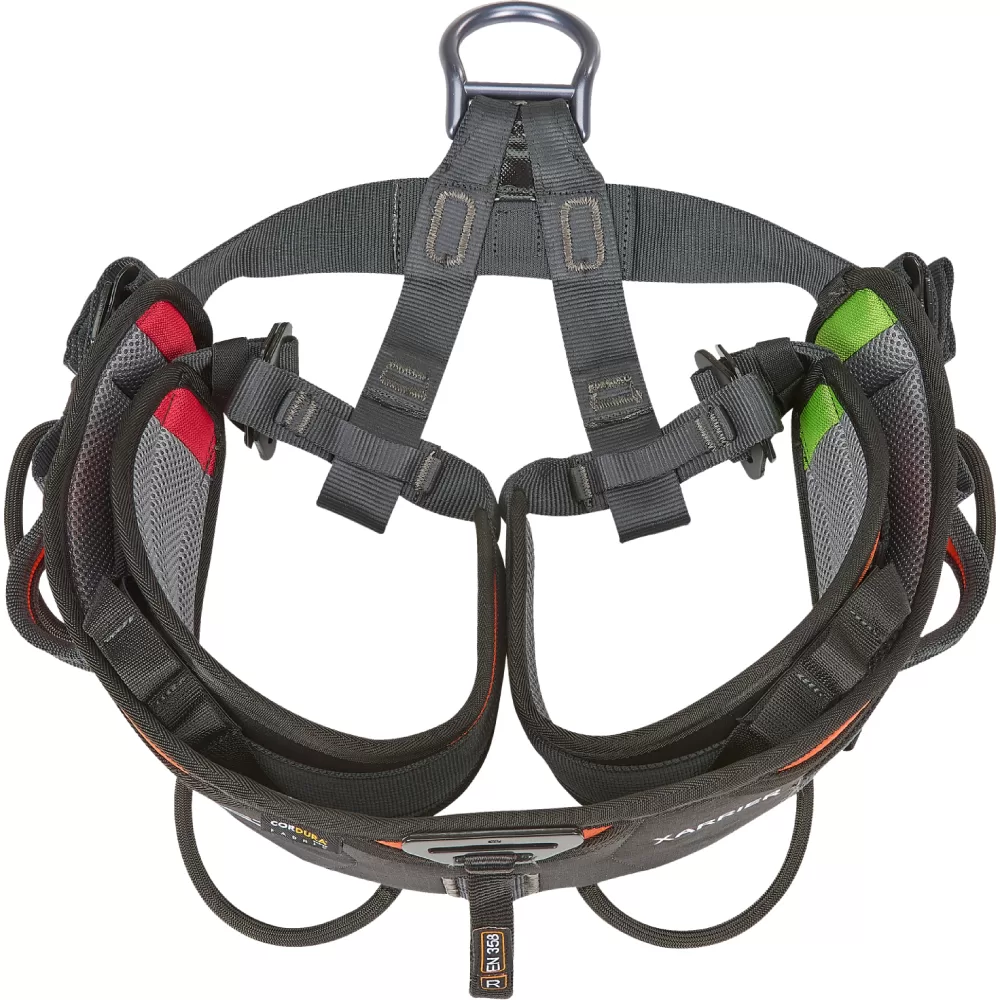 Ergonomic and lightweight seat harness equipped with two lateral attachment points in webbing, a ventral attachment point in light alloy and a rear in webbing. When used in conjunction with TOP X or TOP Y chest harnesses, combines to form a full-body harness (EN 361) with five attachment points, an excellent choice for rope access workers who seek comfort without compromising on weight.